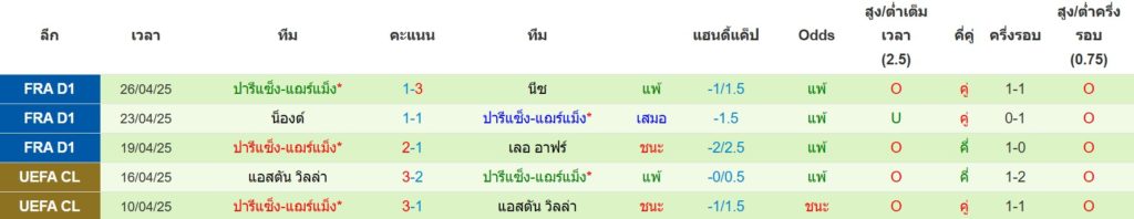 สถิติ 5 นัดล่าสุดของ ปารีส แซงต์ แชร์กแมง : ชนะ 2 เสมอ 1 แพ้ 2