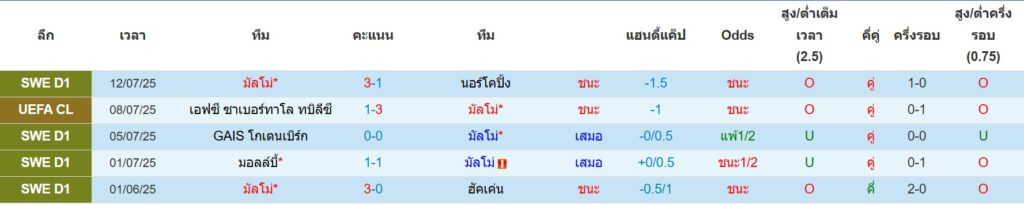 สถิติ 5 นัดล่าสุดของ มัลโม่ : ชนะ 3 เสมอ 2 แพ้ 0