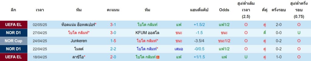 สถิติ 5 นัดล่าสุดของ โบโด กลิมต์ : ชนะ 2 เสมอ 1 แพ้ 2