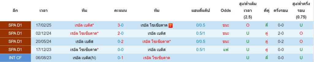 สถิติการพบกันล่าสุดของ : เรอัล เบติส -vs- เรอัล โซเซียดาด
