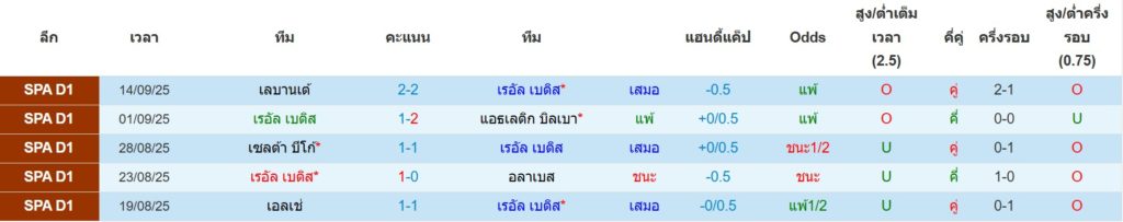 สถิติ 5 นัดล่าสุดของ เรอัล เบติส : ชนะ 1 เสมอ 3 แพ้ 1