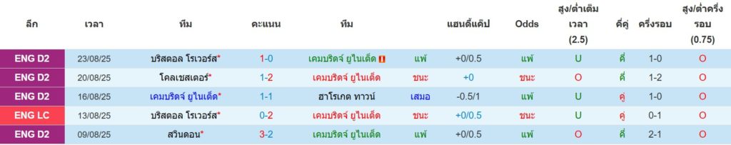 สถิติ 5 นัดล่าสุดของ เคมบริดจ์ : ชนะ 2 เสมอ 1 แพ้ 2