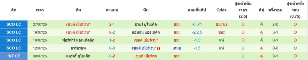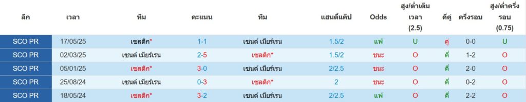 สถิติการพบกันล่าสุดของ : เซลติก -vs- เซนต์ เมียร์เรน