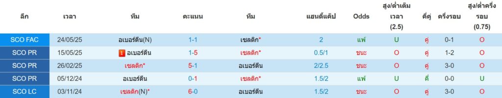 สถิติการพบกันล่าสุดของ : อเบอร์ดีน -vs- เซลติก