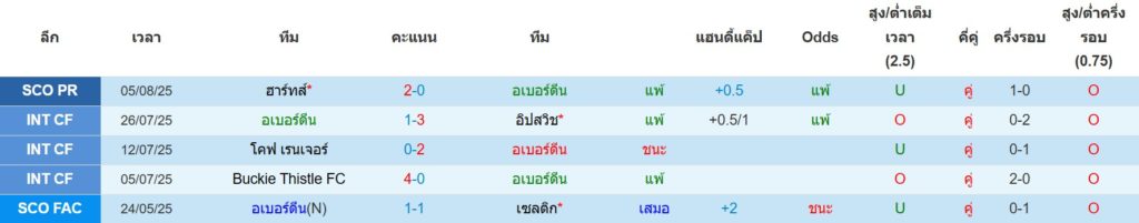 สถิติ 5 นัดล่าสุดของ อเบอร์ดีน : ชนะ 1 เสมอ 1 แพ้ 3