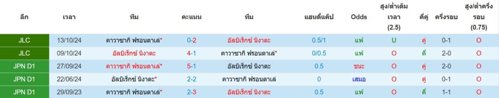 สถิติการพบกันล่าสุดของ : คาวาซากิ ฟรอนตาเล่ -vs- อัลบิเร็กซ์ นิงาตะ