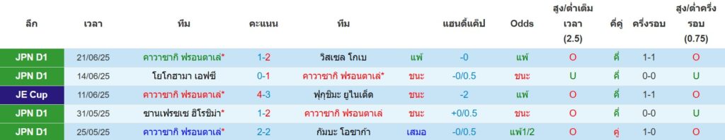 สถิติ 5 นัดล่าสุดของ คาวาซากิ ฟรอนตาเล่ : ชนะ 3 เสมอ 1 แพ้ 1