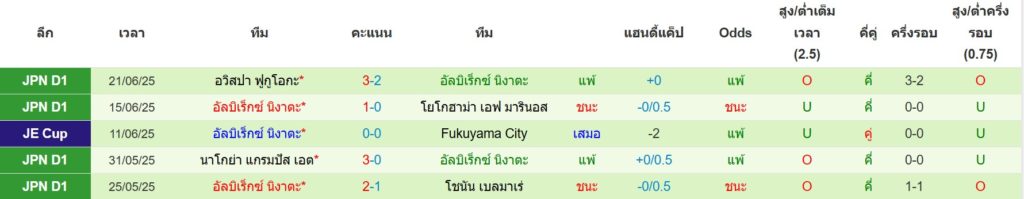 สถิติ 5 นัดล่าสุดของ อัลบิเร็กซ์ นิงาตะ : ชนะ 2 เสมอ 1 แพ้ 2