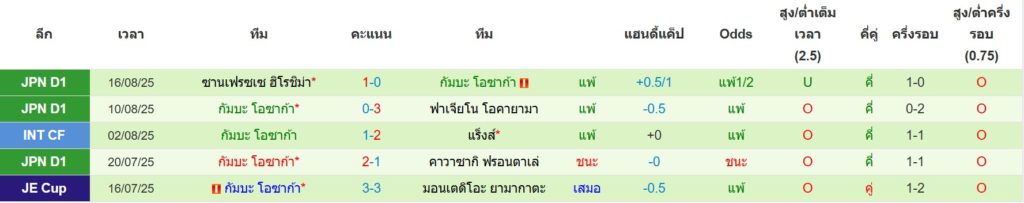 สถิติ 5 นัดล่าสุดของ กัมบะ โอซาก้า : ชนะ 1 เสมอ 1 แพ้ 3