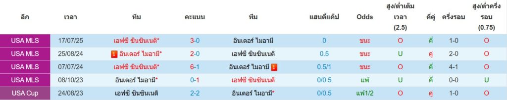 สถิติการพบกันล่าสุดของ : อินเตอร์ ไมอามี่ -vs- เอฟซี ซินซินนาติ