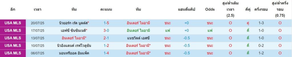 สถิติ 5 นัดล่าสุดของ อินเตอร์ ไมอามี่ : ชนะ 4 เสมอ 0 แพ้ 1