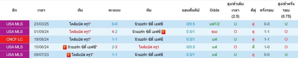 สถิติการพบกันล่าสุดของ : นิวยอร์ค ซิตี้ -vs- โคลัมบัส ครูว์