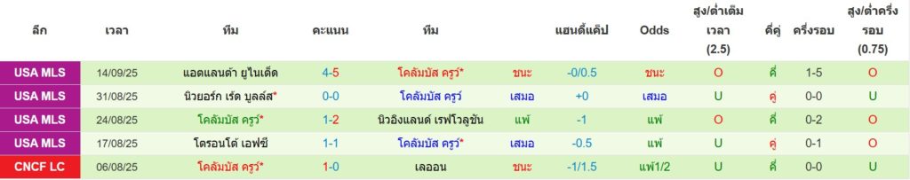 สถิติ 5 นัดล่าสุดของ โคลัมบัส ครูว์ : ชนะ 2 เสมอ 2 แพ้ 1
