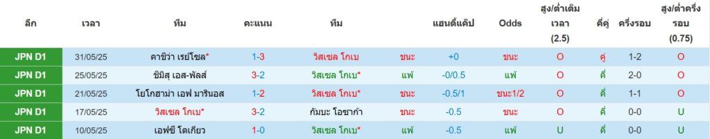สถิติ 5 นัดล่าสุดของ วิสเซล โกเบ : ชนะ 3 เสมอ 0 แพ้ 2