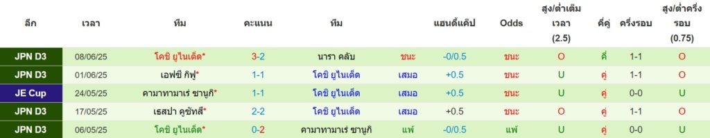 สถิติ 5 นัดล่าสุดของ โคชิ ยูไนเต็ด : ชนะ 1 เสมอ 3 แพ้ 1