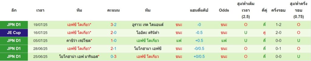 สถิติ 5 นัดล่าสุดของ เอฟซี โตเกียว : ชนะ 2 เสมอ 2 แพ้ 1