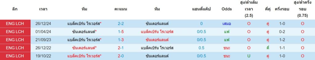 สถิติการพบกันล่าสุดของ : ซันเดอร์แลนด์ -vs- แบล็คเบิร์น โรเวอร์