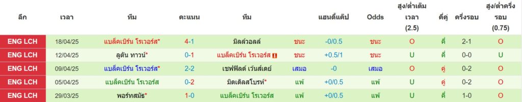 สถิติ 5 นัดล่าสุดของ แบล็คเบิร์น โรเวอร์ : ชนะ 2 เสมอ 1 แพ้ 2
