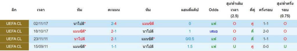 สถิติการพบกันล่าสุดของ : แมนฯซิตี้ -vs- นาโปลี
