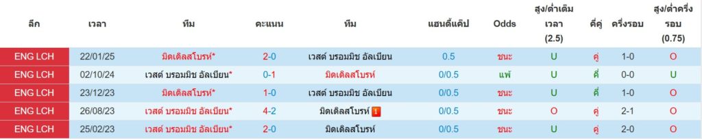 สถิติการพบกันล่าสุดของ : มิดเดิ้ลสโบรช์ -vs- เวสต์บรอมวิช