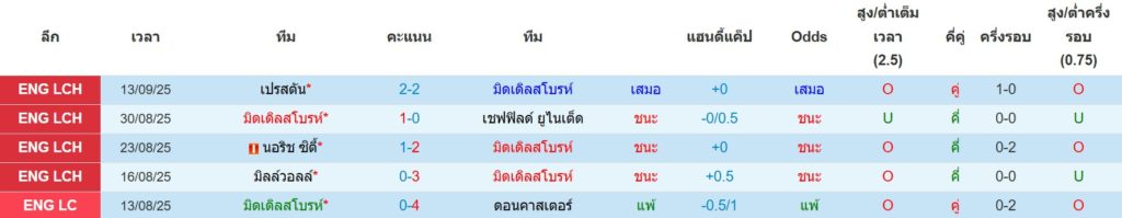 สถิติ 5 นัดล่าสุดของ มิดเดิ้ลสโบรช์ : ชนะ 3 เสมอ 1 แพ้ 1