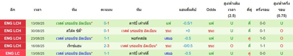 สถิติ 5 นัดล่าสุดของ เวสต์บรอมวิช : ชนะ 2 เสมอ 2 แพ้ 1
