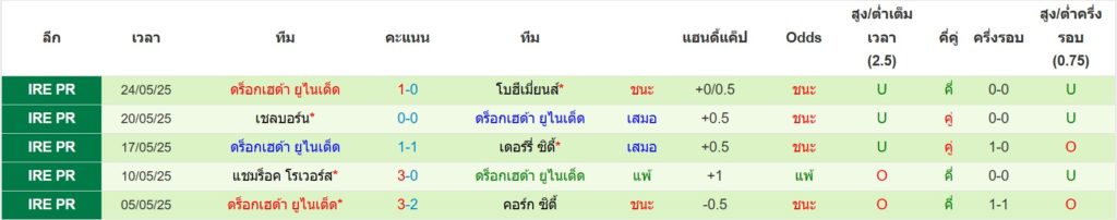 สถิติ 5 นัดล่าสุดของ ดร็อกเฮด้า ยูไนเต็ด : ชนะ 2 เสมอ 2 แพ้ 1