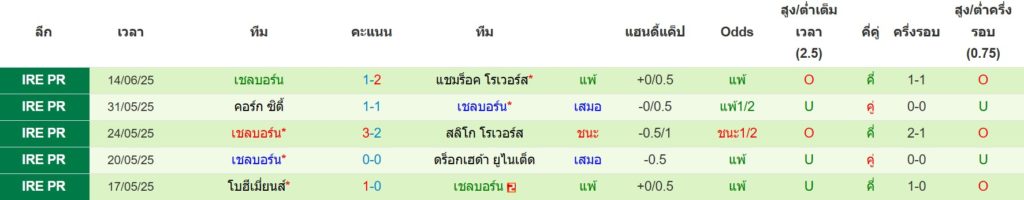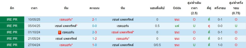สถิติการพบกันล่าสุดของ : เซนต์ แพทริคส์ -vs- เชลบอร์น
