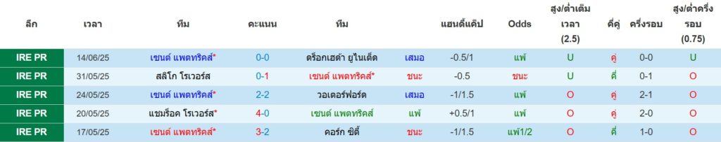 สถิติ 5 นัดล่าสุดของ เซนต์ แพทริคส์ : ชนะ 2 เสมอ 2 แพ้ 1