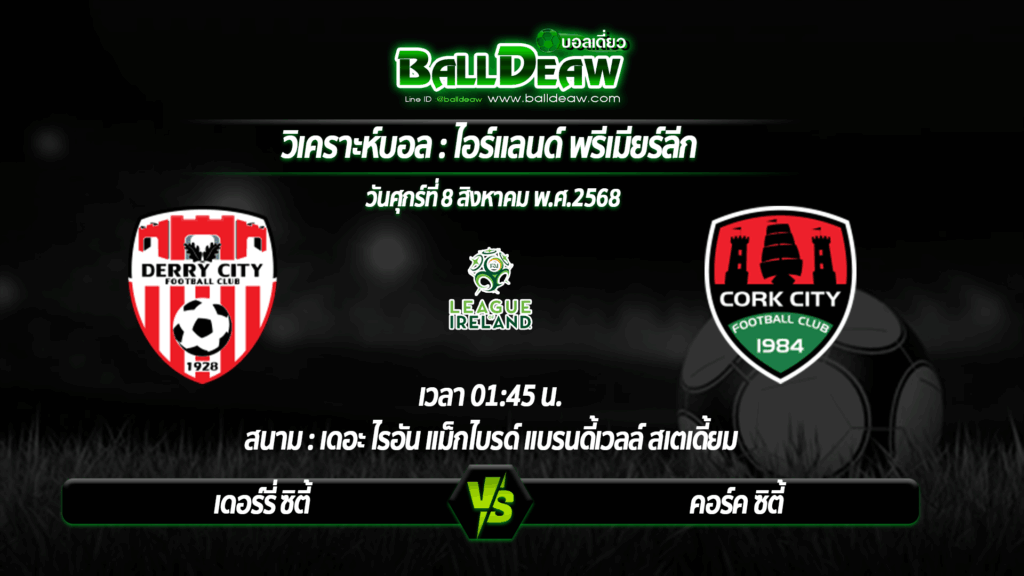 วิเคราะห์บอล ไอร์แลนด์ พรีเมียร์ลีก : เดอร์รี่ ซิตี้ -vs- คอร์ค ซิตี้ ( 08 ส.ค. 68 )