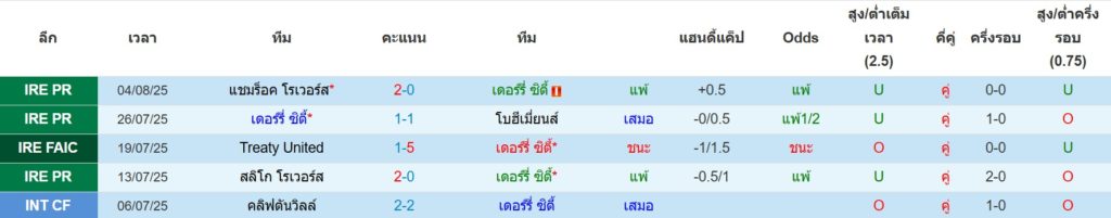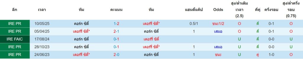 สถิติการพบกันล่าสุดของ : เดอร์รี่ ซิตี้ -vs- คอร์ค ซิตี้